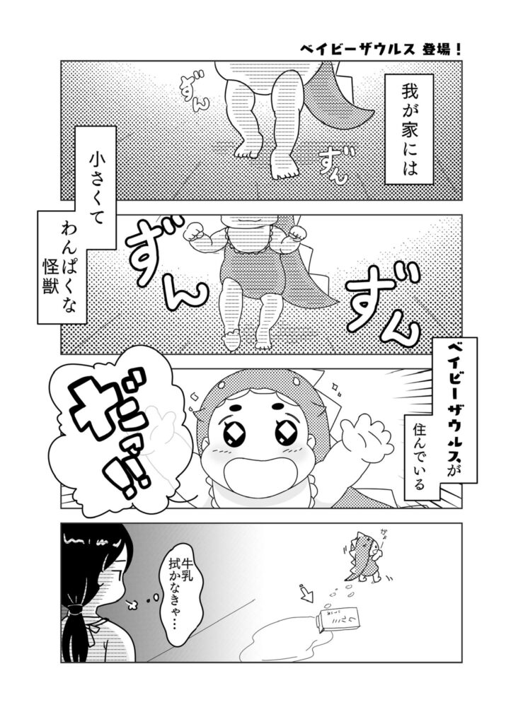 【わんぱくかいじゅう ベイビーザウルス】 元気いっぱいのベイビーがいる毎日はまるで 「小さくてわんぱくな怪獣」 が住んでいるみたい?! 桃子ちゃん率いる山田家のドタバタでにぎやかな日常4コマ漫画お楽しみください!